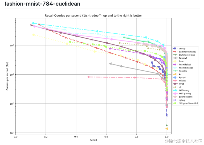 (4)hnsw的ann算法实现在效果上表现最好,如图10是在2020-07-12在fashion-mnist-784-euclidean数据集上的测试结果,越往右越靠上代表效果越好;