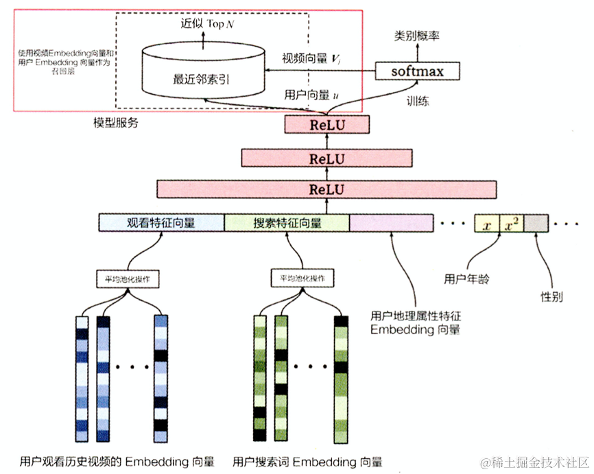 深度学习的流行与embedding技术的发展,使得embedding具备了综合信息的能力强、能将高维稀疏特征向量转换成低维稠密特征向量、能通过向量运算揭示内容及用户相似度等特点。 embedding本身也是极其重要的特征向量。embedding自身表达能力的增强使得直接利用embedding生成推荐列表成了可行的选择。因此,利用embedding向量的相似性,将embedding作为推荐系统召回层的方案逐渐被推广开来。以下图2是YouTube推荐利用embedding进行候选物品进行召回的做法。