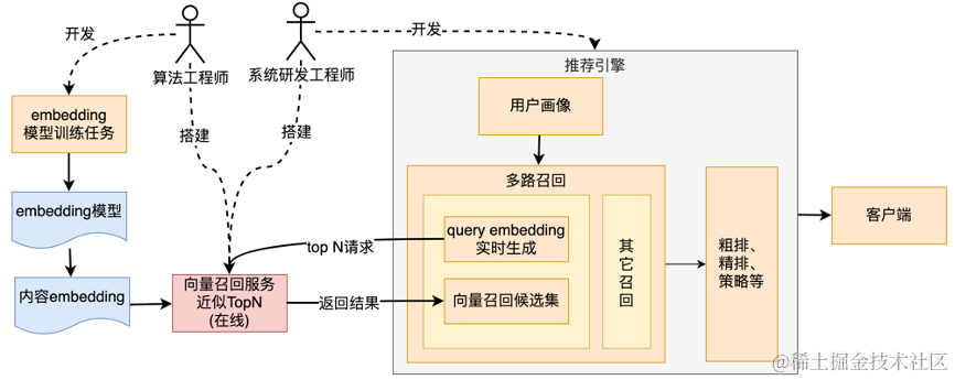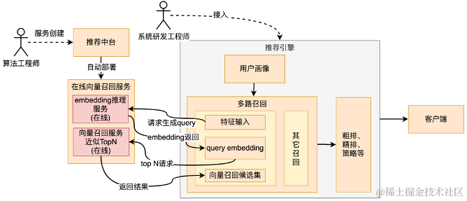 如果我们基于图3,来看向量召回服务的接入过程,将会得到图4的结果。算法工程师将基于业务特点,进行算法编写并产出embedding,同时,系统研发工程师和算法工程师将协作搭建起在线的向量召回服务,供推荐引擎调用,推荐引擎负责线上所有用户的推荐,其对性能的要求是非常高的,因此向量召回服务的性能也极其重要。对于不同业务而言,如果向量召回服务没有通用化与服务化, 则不同业务的算法与系统开发工程师各自需要重复搭建,且需要自行进行服务运维, 这无疑是增加了推荐开发工程师的负担,也是对开发效率的损耗。