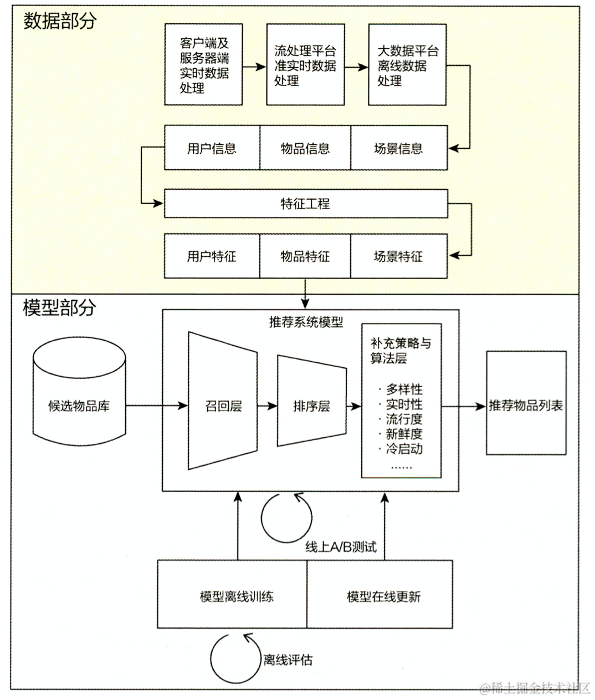 推荐系统的架构已在多本书籍与多篇文章中被提及,而较为经典的流程描述之一如图1所示。从图中我们可知一个推荐服务包括几个模块:推荐池、用户画像、特征工程、召回、排序、策略等。 我们可以看到,整个推荐流程中,召回处在整个环节的第一环,它从整体内容池中圈定了一个子集,供推荐系统从中再择优吐出至用户面前。从这个角度而言,召回候选集的好坏,从很大程度上决定了推荐的整体好坏,召回的重要性也就不言而喻。