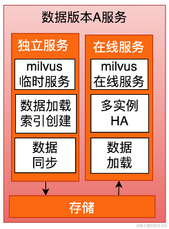在milvus的使用过程中,我们也发现了一些问题, 例如,milvus在索引构建时CPU使用率会非常高,导致查询服务基本不可用,针对这个问题,我们也进行了解决,当我们进行数据版本更新时,我们会另起一个服务单独更新,而当更新完成时,会进行线上服务的替换,线上数据版本会保留最近2个版本。如图7所示。