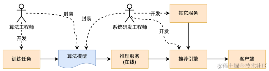 在一个推荐系统的研发过程中,往往需要算法工程师与系统研发工程师的紧密协作,前者的职责是基于业务实现可用的算法模型,而后者的职责,一者是协同算法工程师将模型封装服务化,二者是开发推荐引擎及其它依赖子服务将整个推荐流程进行串联,供下游调用推荐接口,如图3所示。