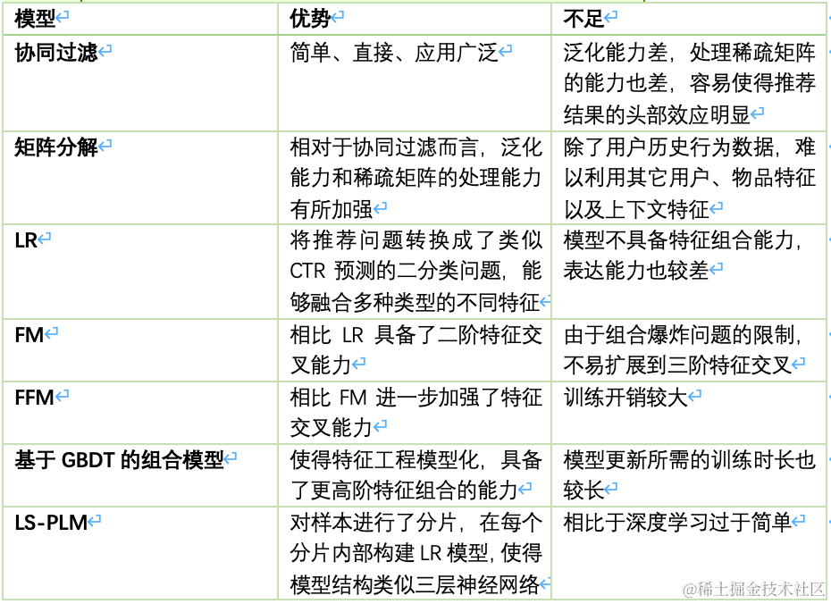 对于召回而言,有不少耳熟能详的方法,常见模型对比如下。