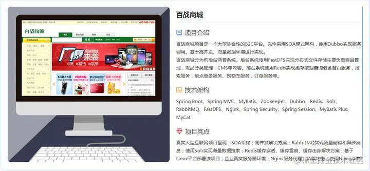 项目介绍:百战商城项目是一个大型综合性的B2C平台。完全采用SOA模式架构,使用Dubbo实现服务调用。基于高并发、海量数据环境进行实现。