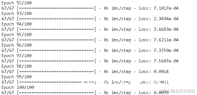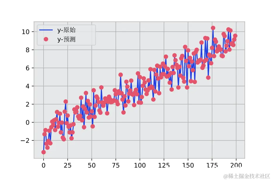 我们将上述模型纳入Keras回归模型中,用x和y的数据拟合模型。然后,我们可以预测x数据。