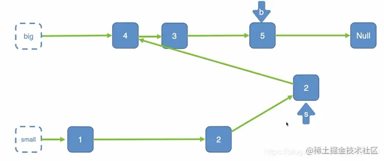 当所有节点都放置完成后,将small链表的尾部链接big链表的头部,这样就形成了所求的链表。
