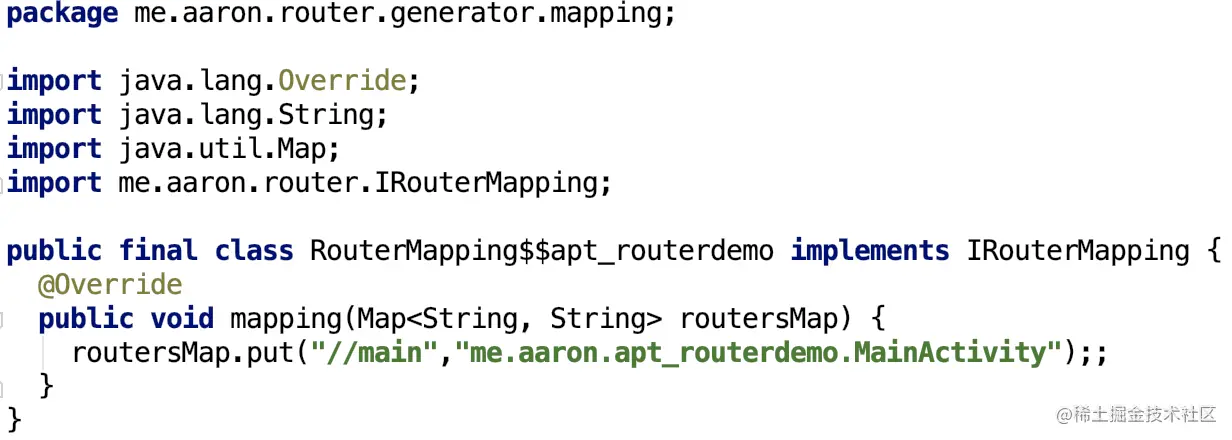 通过APT和Java代码的生成,我们完成了路由框架的最基础的工作:路由映射的建立。将模块对应的Uri和实际的Activity的路径的映射,保存在了各个模块的RouterMapping$$XXX这个对象中,后面就是我们通过遍历调用这些生成对象的mapping方法,将这个映射关系输出到Map对象中,这样一张路由表就建立起来了。