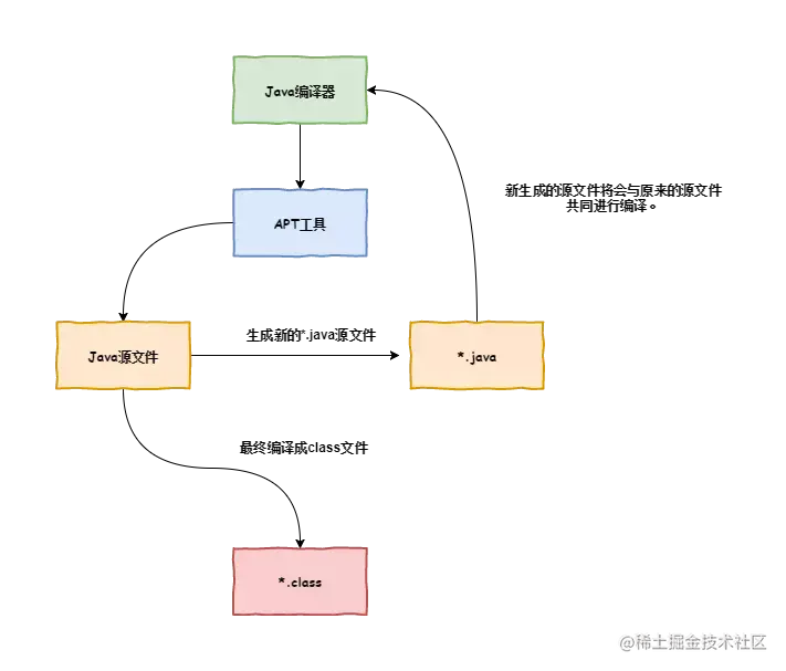 APT除了可以扫描解析注解,我们还可以在处理注解的过程中间插入根据注解生成新的源代码文件的逻辑,并最终,将新生成的代码文件与原来的代码文件共同编译。