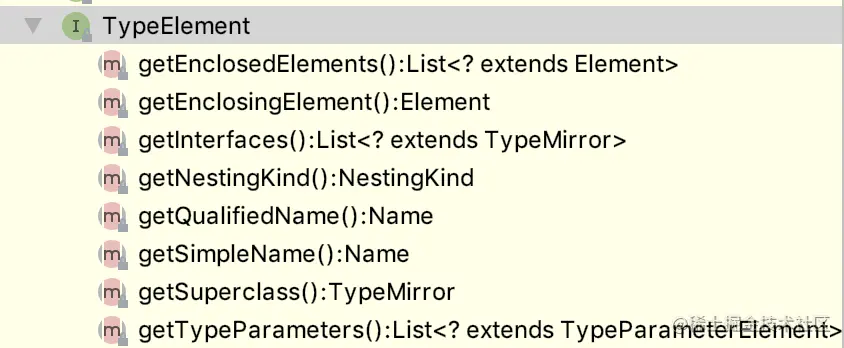 提供了比如getQualifiedName获取此元素的规范名称(比如me.aarom.apt.Test就是上面Test示例的规范名称),getSuperclass获取此元素类型的直接父类(如果此元素是个接口或者java.lang.Object,那么获取到的就是NoType,表示没有父类型),比如getInterfaces获取此类实现的接口(如果是个接口,则返回他的父接口)。