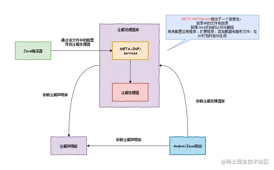 META-INF里面存放的是包含我们jar包的一些配置信息,在javac编译的时候,会在jar包的META-INF中查找实现了AbstractProcessor的子类,然后去调用它们。和Android中的Activity需要在Manifest文件中注册才能工作是相似的道理。