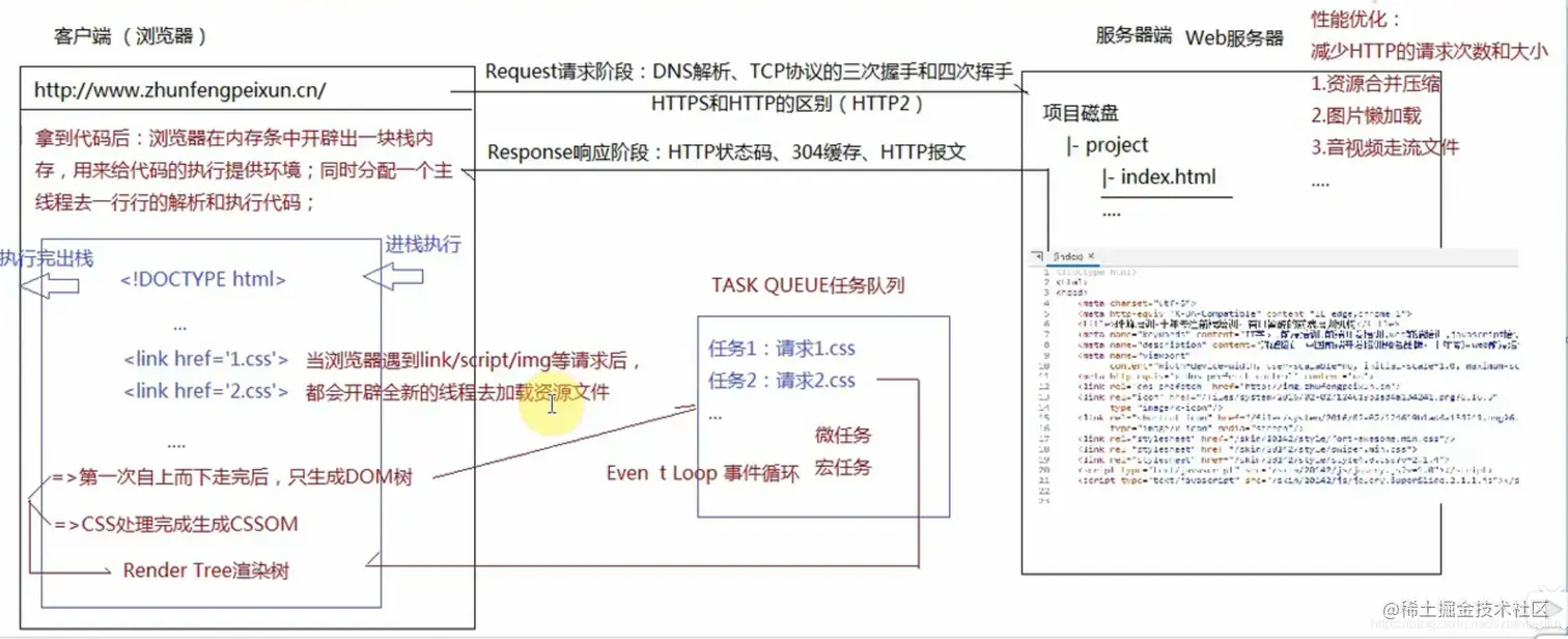 在得到html代码后,浏览器会在内存条中开辟一块栈内存 ,用来给代码的执行提供环境,同时分配一个主线程用来逐行进行解析和执行代码。我们都知道JavaScript语言最大的特点就是单线程的,也就是说同一时间只能做一件事,所以这里就涉及到了一个专业术语:“进栈执行,执行完出栈”。也就是说在进行逐行html代码解析时,一定要等到上一行代码执行结束并且出栈后,主线程才会空出,下一行代码才能进栈执行。