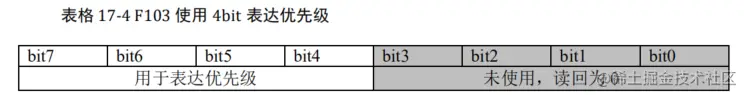如上图,可以看到它随着组号的增大,抢占优先级可设置的位越少,子优先级越多。