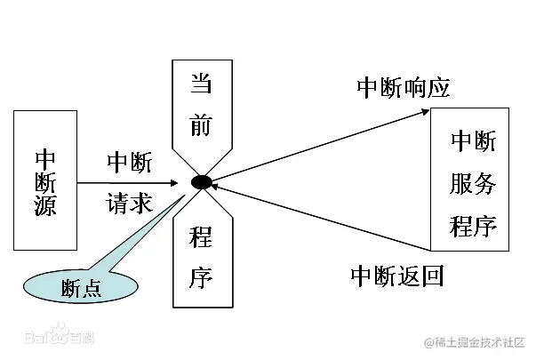 中断,即机器运行过程中出现某些意外情况,需机器停止正在运行的程序并转入处理新情况的程序,处理完毕后又返回原被暂停的程序继续运行。