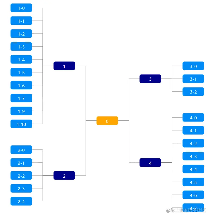 虽然 D3 有linkVertical和linkHorizontal连线构造器,但是他们构造的连线都是曲线,我们这里采用在两点的 X 轴中点出弯折的折线来作为连线。