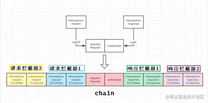 之后,就是通过一个 while 循环,对 chain 数组中存储的拦截器逐个调用,其中涉及到每个拦截器工作后的 promise 对象的状态和结果值的传递。这个过程有点像是跳板,如下图所示: