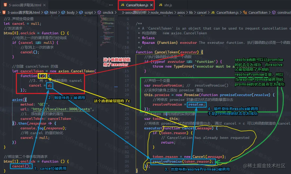 经过上面的铺垫,我们就将分析的重点转移到了【如何让 cacelToken 实例对象身上的 promise 属性的状态变为成功】上。