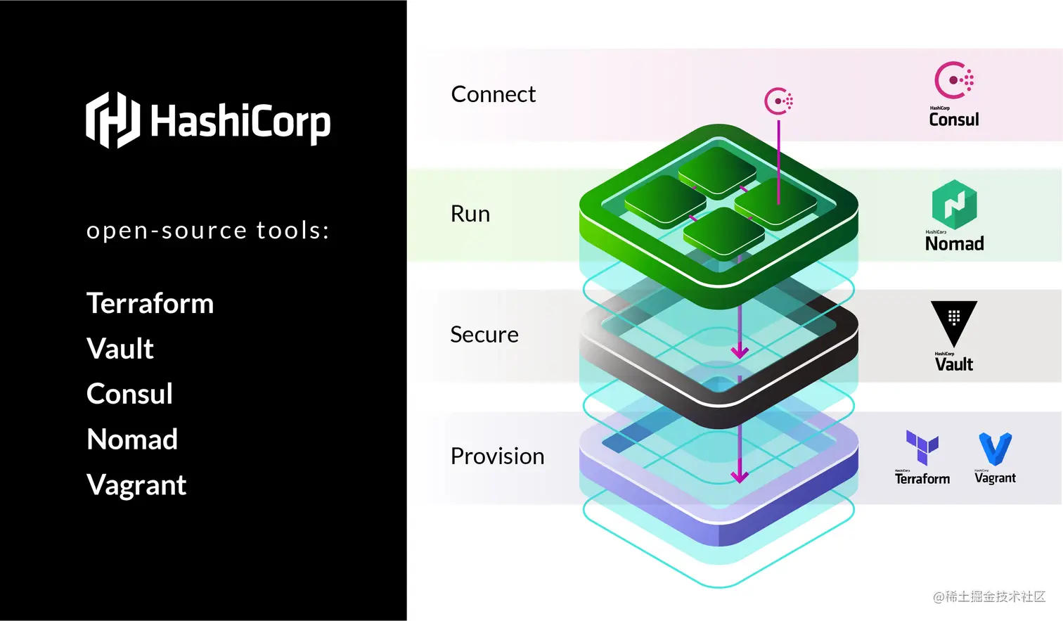 Consul 是由 HashiCorp 公司开发的,它是一家专注于 DevOps 工具链的公司,旗下的明星级产品包括 Vagrant、Terraform、Vault、Nomad 以及 Consul,这些工具贯穿了持续交付的整个流程。