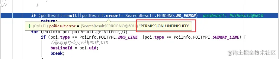 二、 有一点需要注意,就是如果你在onCreate()方法中进行公交路线检索时会在回调函数中,出现错误,提示PERMISSION_UNFINISHED。目前官方也没有说明错误原因,提示许可未完成。