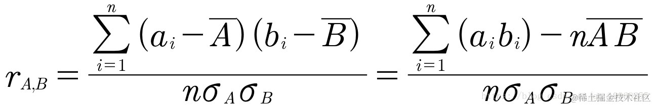 其中,n是元组的个数,ai和bi分别是元组i在A和B上的值,和分别是A和B的均值,和分别是A和B的标准差,而