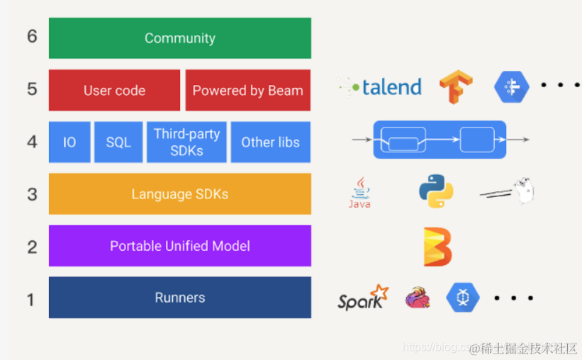 - 第四层,是可扩展库层。工程师可以根据已有的BeamSDK,贡献分享出更多的新开发者SDK,IO连接器,转换操作库等等。