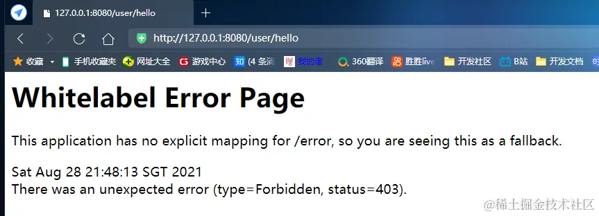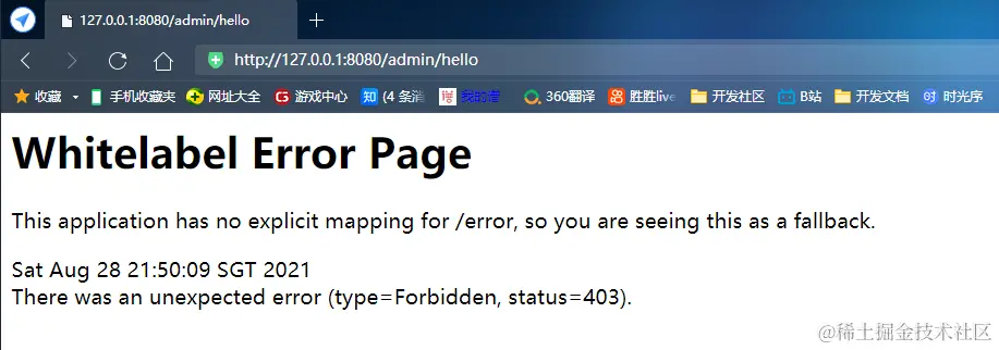 - “user"角色访问/admin/hello,可以看到是不能正常访问的,/admin/hello只有”admin"角色的用户可以访问