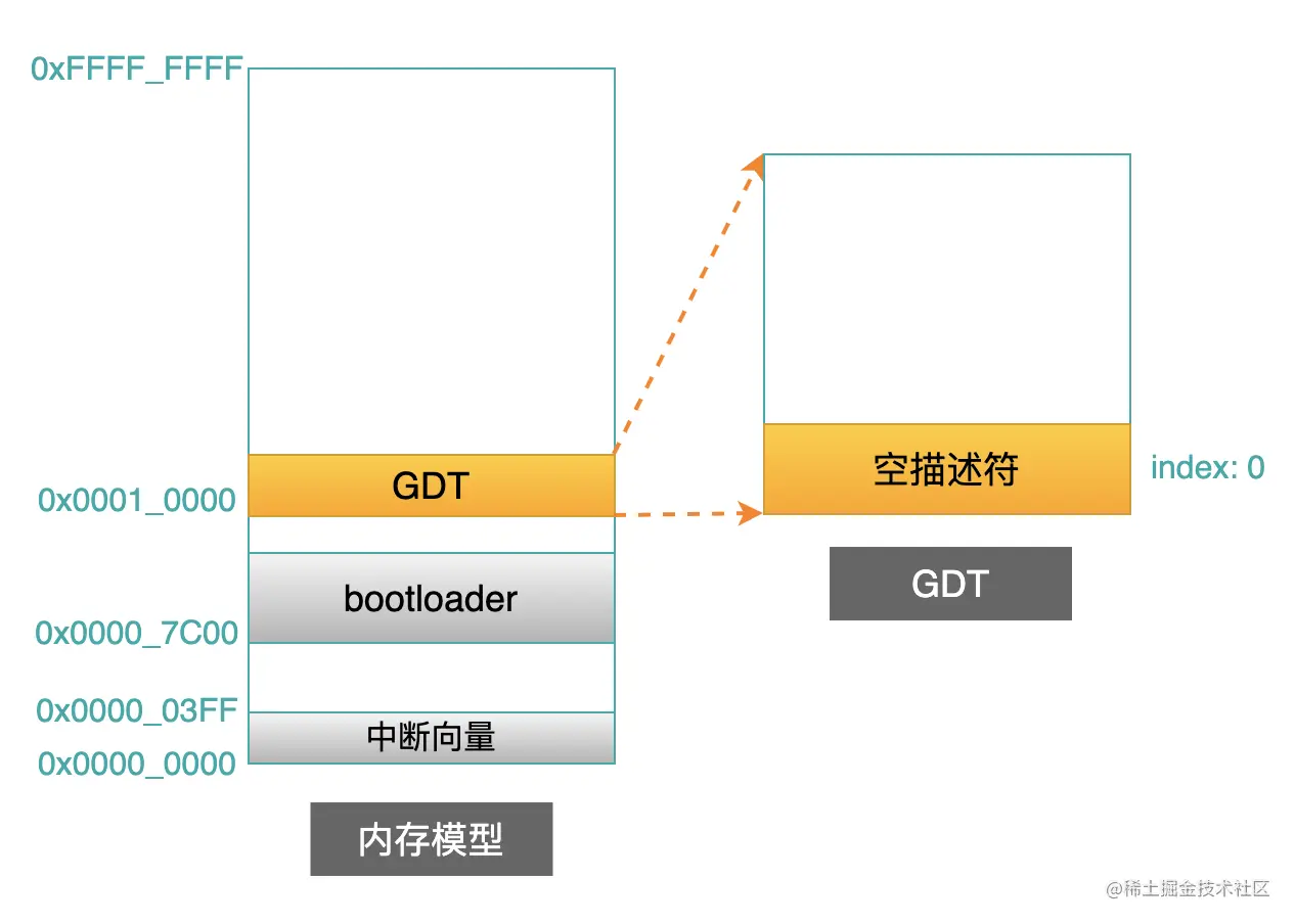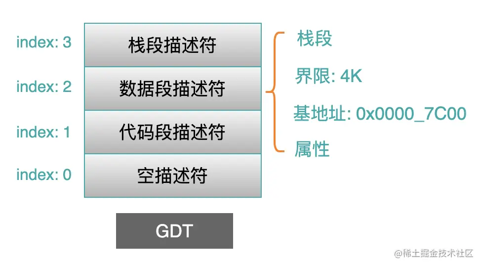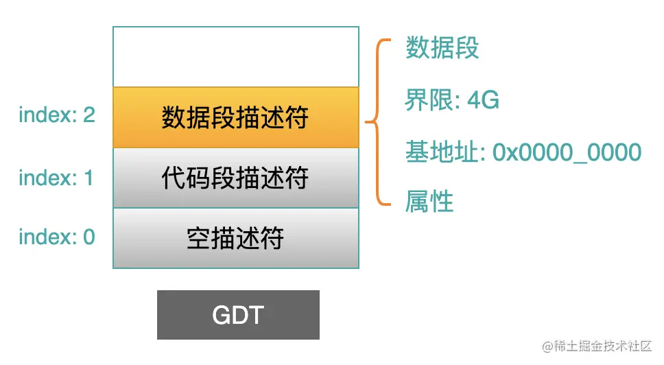 在以后文章中,我们还会看到在保护模式下,bootloader 仍然会利用 OS 的 header 空间,来传递段的索引号。然后 OS 利用这个段索引号,去查找 GDT 表,从而找到每一个段的基地址以及其他一些保护信息。