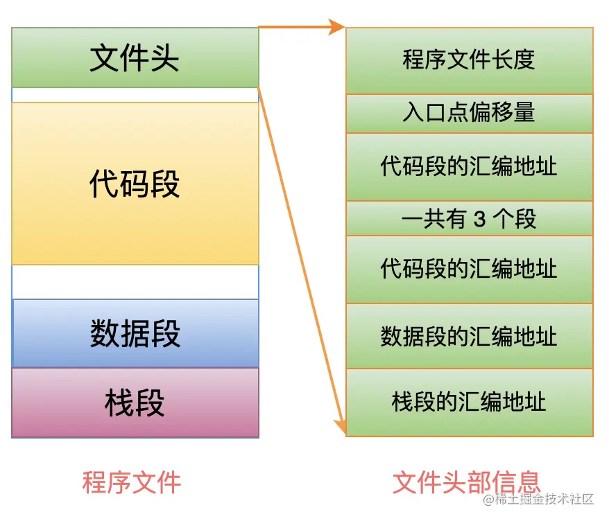 这样的话,程序开始执行时,就可以从自己的 header 中获取到这 3 个段基地址,并且赋值给相应的寄存器,从而顺利的执行程序。