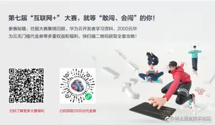 作为第七届“互联网+”大赛的深入参与者,华为为大学生参赛者提供了 2000 元华为云无门槛代金券,可购买 6 大领域 20+云产品资源。更有参赛秘籍、往届大赛集锦回顾级华为云开发者学习资料等多重权益和福利。还等什么,快扫描小程序二维码领取全套攻略吧!