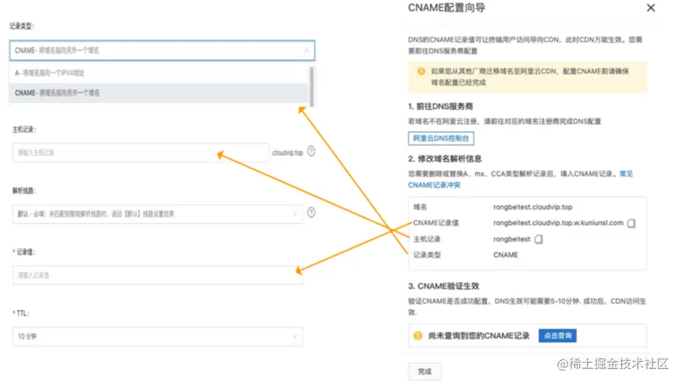完成推荐配置后,还有非常重要的一步:为CDN加速域名添加CNAME解析记录,成功后才会真正开启加速服务。