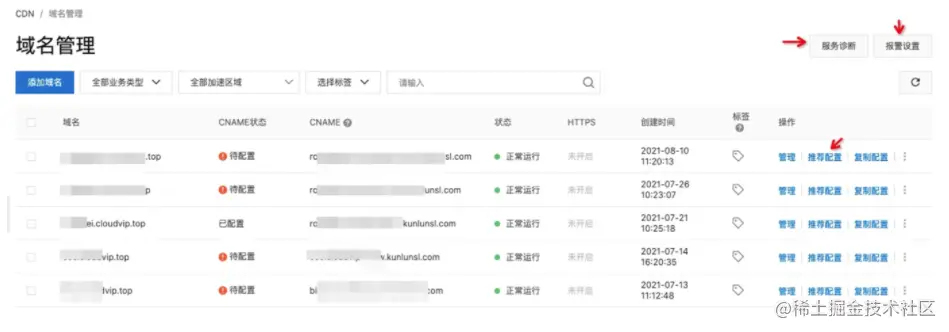 ②域名管理列表增加CDN问题诊断入口,方便使用者快速查询并定位问题和解决。