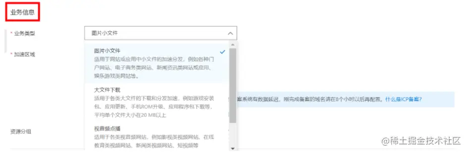 ②业务信息:主要包含业务类型和加速区域的添加。您可以结合实际的业务需要,来选择对应的业务类型,每次添加仅可选择一种业务类型。业务类型包括:图片小文件、大文件下载、视音频点播、全站加速共4种类型。