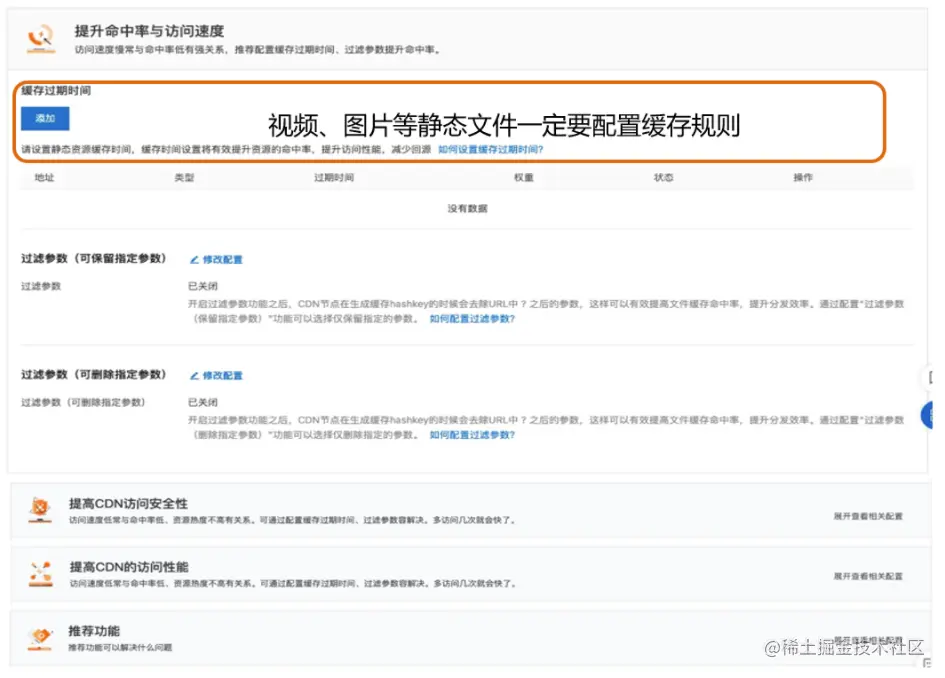 - CDN的原理是缓存加速,设置缓存过期时间后,会帮助终端设备在访问CDN时,能直接命中边缘节点的缓存内容,提升访问速度,热门的访问视频,图片等,建议可以设置1月以上的缓存时间;
