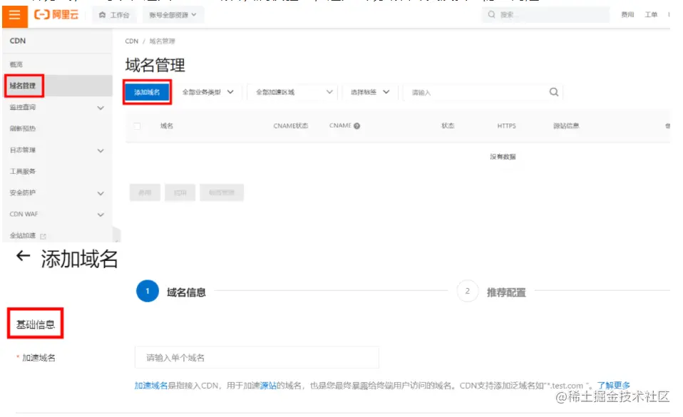 ①基础信息:登录阿里云CDN控制台,点击左侧导航栏“域名管理”选择“添加域名”,完成基础信息-域名信息的填写。请注意,添加的域名必须是归属您自己的域名,如果是首次添加该域名,则需要先完成域名归属权的验证,验证成功后,该主域名下的2,3级域名就可以直接添加。目前为您提供DNS解析验证和文件验证两种方式,您可以任选其一完成域名归属权验证,避免出现域名冲突及安全隐患问题。