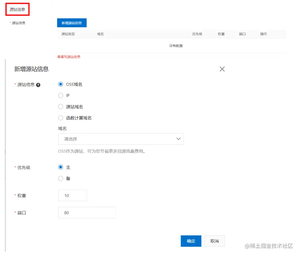 ③源站信息:点击“新增源站信息”,目前共有4种源站类型可以选择,oss域名、IP、源站域名、函数计算域名,可以同时设置不同类型的源站,支持设置多个源站,多源站需要设置优先级,权重,端口等信息,用户可以根据实际的源站述求,灵活完成参数配置。