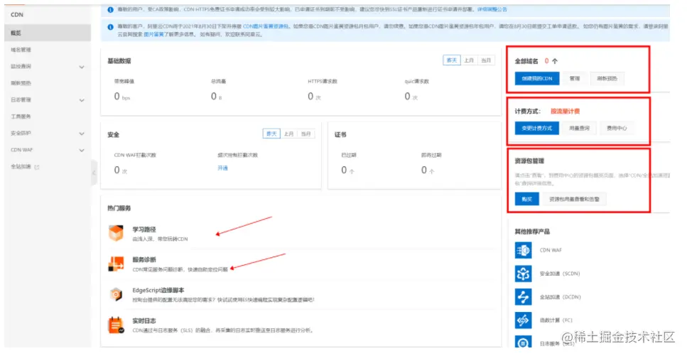 ②在热门服务中,增加了学习路径和自助服务诊断的工具,便于加深用户对边缘云CDN理解和使用,同时引导客户可以直接通过自助工具定位问题,解决操作障碍。