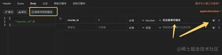 对于raw类型的body参数,我们可以通过点击“提取字段和描述”来针对参数进行描述的填写: