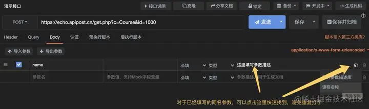 如图中所示,对于一个填写过的参数,我们可以在新建接口可以通过点击参数描述后面的♦️方块标志快速导入描述,不用重复打字。