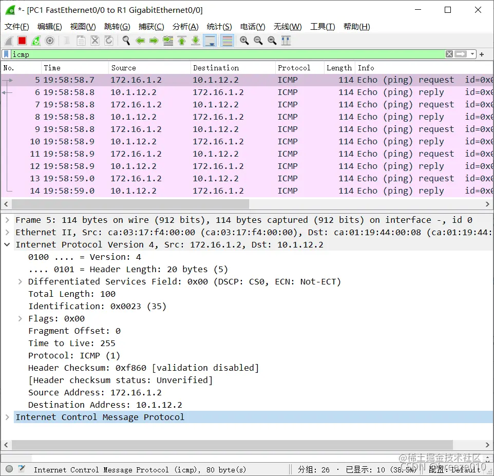 在R1的G1/0抓包发现数据包的原IP地址已经被转化为这个接口的IP地址