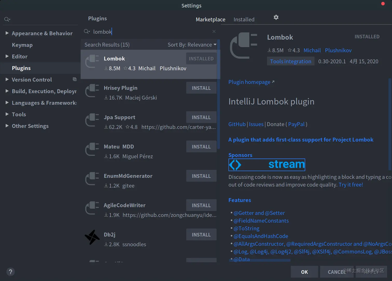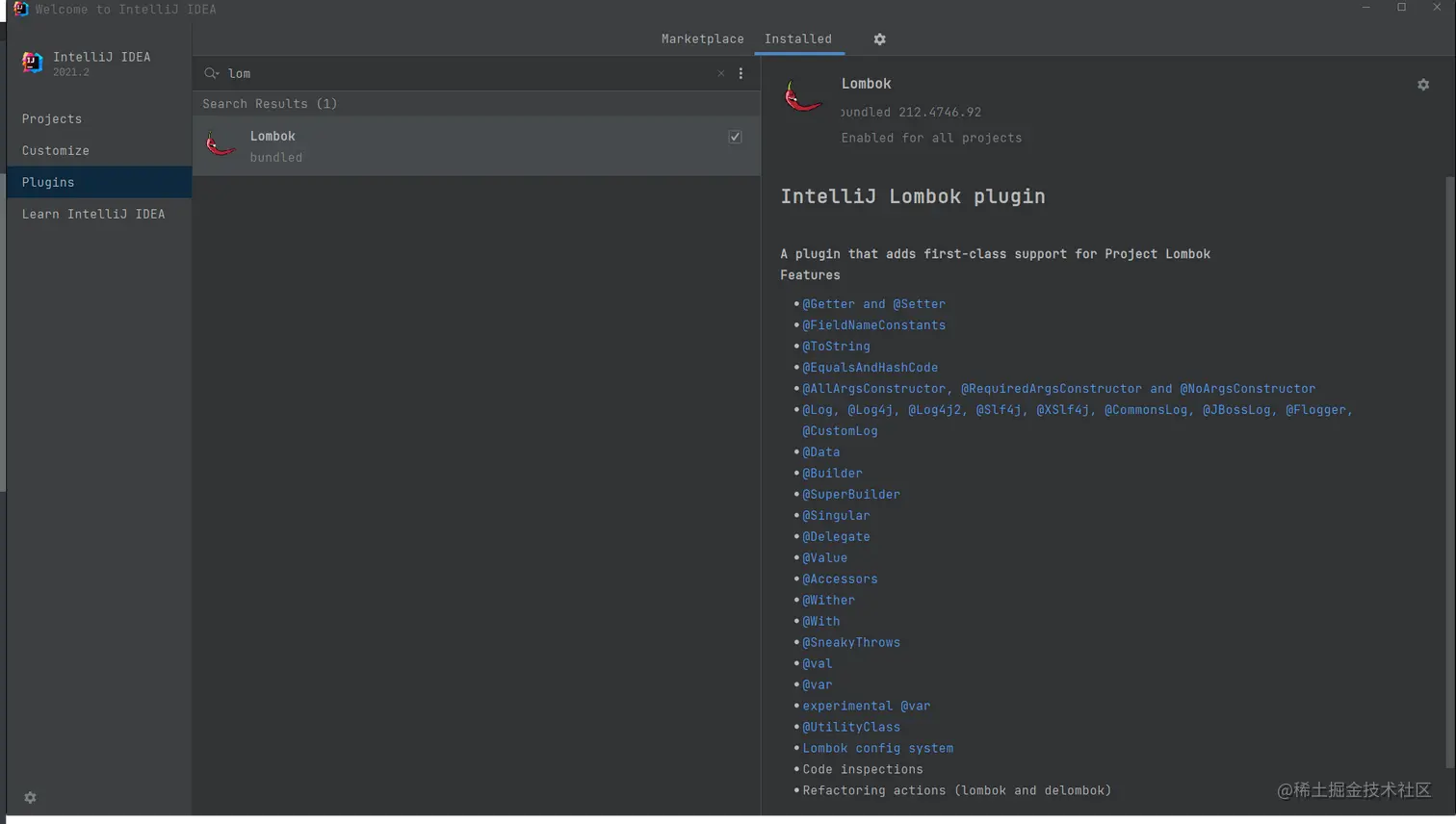 在先前 IDEA 的版本中,Lombok 是需要通过插件来安装的,安装方法如下:依次进入File -> Settings -> Plugins,然后搜索 Lombok ,最后进行安装即可。而在新版本的 IDEA 中,Lombok 已经被集成到 IDEA 中,我们不用再去安装它就可以直接使用,可以说是十分方便了。