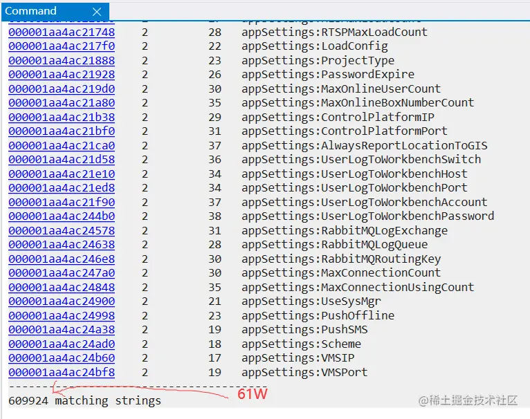 然后用 !strings 命令进行了模糊匹配,发现这样的string 高达 61w 。。。