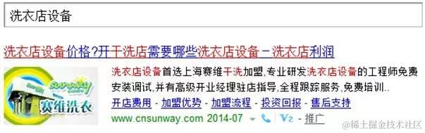 例如,在百度的搜索结果里投放竞价广告,按照点击付费,通过点击率转化率的估算,广告主的广告效果立竿见影,因此这类广告的主要目的是“促成交易” 。例如,下列对搜索词“洗衣店设备”投放的搜索广告:\