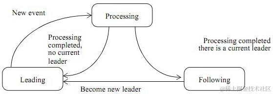 (4)事件/任务来到时,leading线程会对其进行处理,从而转化为processing状态,处理完成之后,又转变为following;