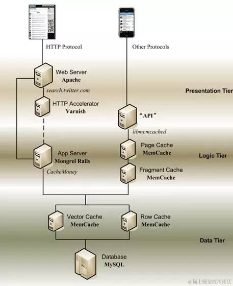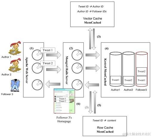 关于cache的使用,是twitter架构的一大看点,带cache的架构清晰如下: