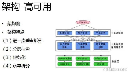 (3)面对更大的流量时,通过垂直拆分、服务化、反向代理、开发框架(站点/服务)等等手段,可以不断提升高可用(研发效率);