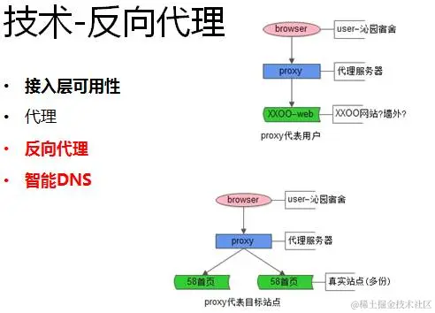 什么是反向代理? 反向代理代表的是58网站,用户不用关注访问是58同城的哪台服务器,由反向代理来代表58同城。58同城通过反向代理,DNS轮询, LVS等技术,来保证接入层的高可用性。