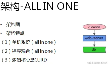 这是一个单机系统,所有的站点、数据库、文件都部署在一台服务器上。工程师每天的核心工作是CURD,浏览器端传过来一些数据,解析GET/POST/COOKIE中传过来的数据,拼装成一些CURD的sql语句访问数据库,数据库返回数据,拼装成页面,返回浏览器。相信很多创业团队的工程师,初期做的也是类似的工作。
