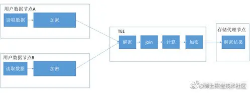 上述联邦计算场景中,需要做join操作,来进行水电局和银行数据的关联。传统方案中,会在TEE中进行碰撞操作,得到关联数据,再进行计算。