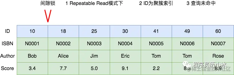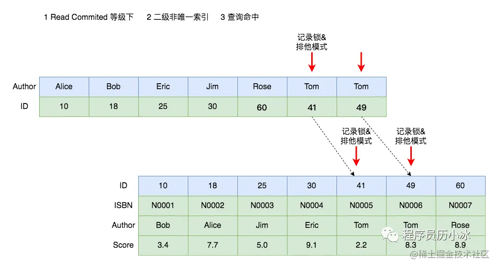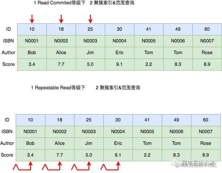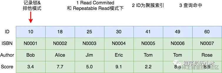 - RC下与等值查询类似,会在ID=10、ID=18、ID=25、ID=30 索引上加排他记录锁,所以,场景1会锁等待,场景2/3不会锁等待。
