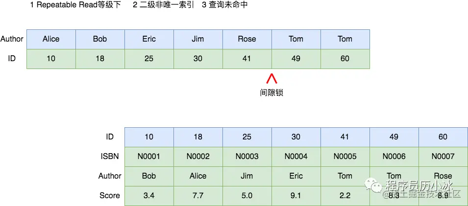 - 事务1会对(Rose61, Tom41)这个区间上间隙锁,间隙锁和间隙锁是互不冲突的,所以:场景1,不会产生锁等待,场景2会产生锁等待。