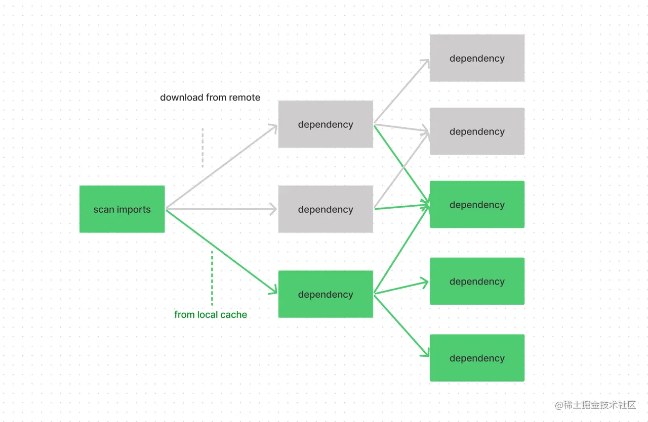 - 首次对项目依赖预处理之后,后续添加依赖只需要从云端下载新添加的依赖 ESM 产物,之后借助 esbuild 重新 bundle 耗时也不会很多。